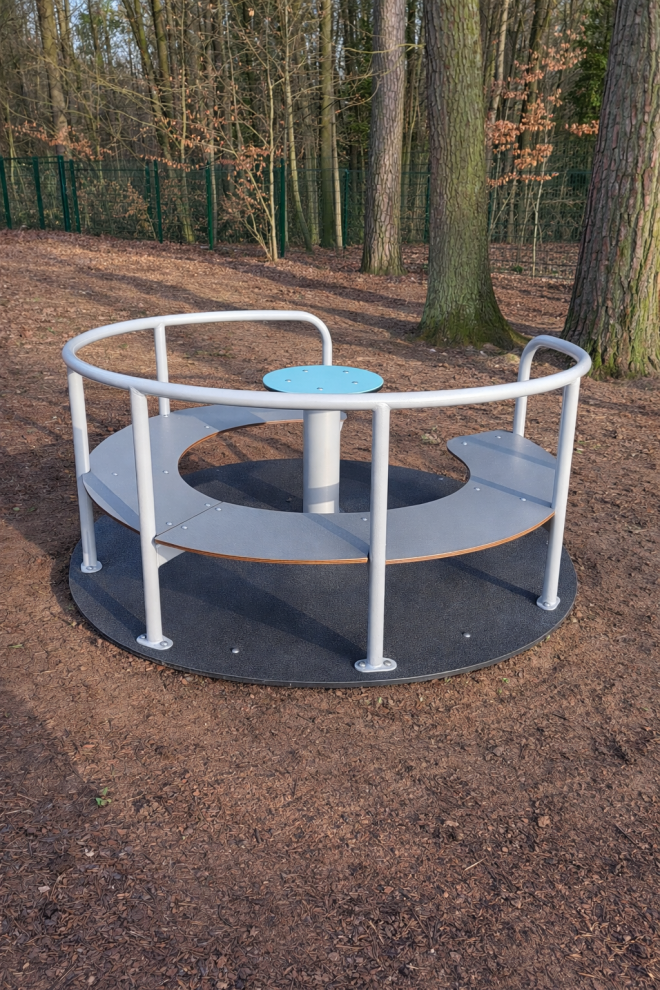 Merry-Go-Round with revolving disc, 3 yaş ve üzeri çocuklar için uygundur ve tasarımında kritik düşme yüksekliği ve güvenlik alanı dikkate alınmıştır. Ürün, çocukların güvenle oynayabileceği şekilde optimize edilmiştir ve düşme yüzeyi gereksinimi bulunmaktadır.